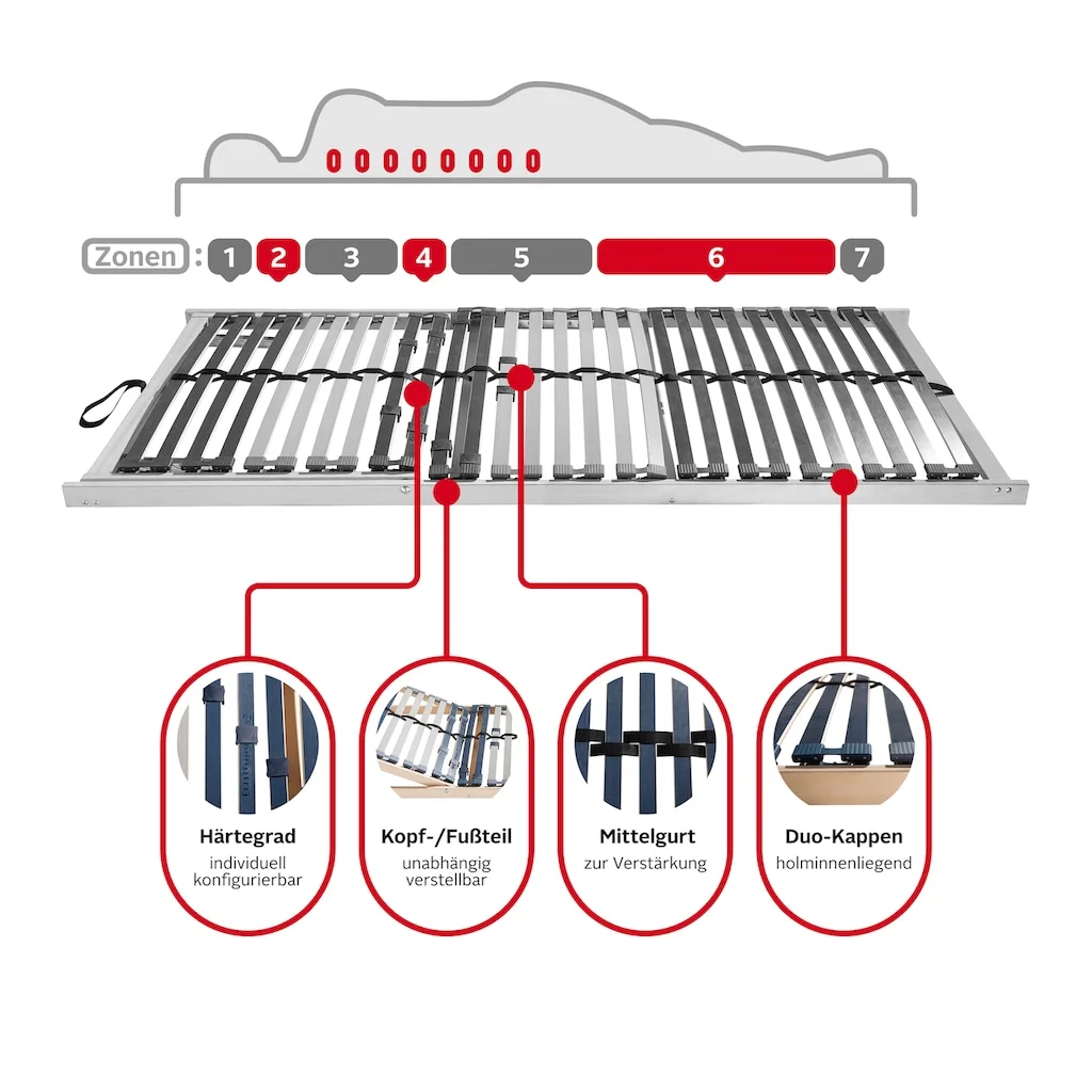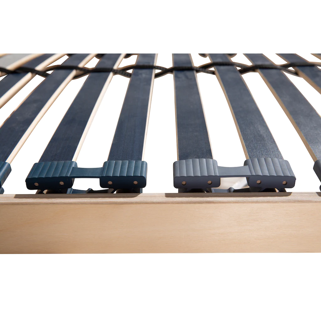 | Top-Features | Die Kappen sind holmüberdeckend gelagert. Sie bieten einen besseren Komfort, da sie eine höhere Federung zulassen. Die Matratze ist komplett bis zum Rand hin unterfedert – liegen zwei Lattenroste nebeneinander, entsteht somit keine Besucherritze.Doppelleisten zur Härtegradregulierung – Dieser Lattenrost ermöglicht es, individuelle Einstellungen vorzunehmen: Seitenschläfer stellen sich eine weiche Schulterzone ein, Bauchschläfer eine stärkere Stützfunktion, damit die Wirbelsäule nicht »durchhängt«. Je mehr Doppelleisten, desto genauer und besser kann die Einstellung erfolgen. |