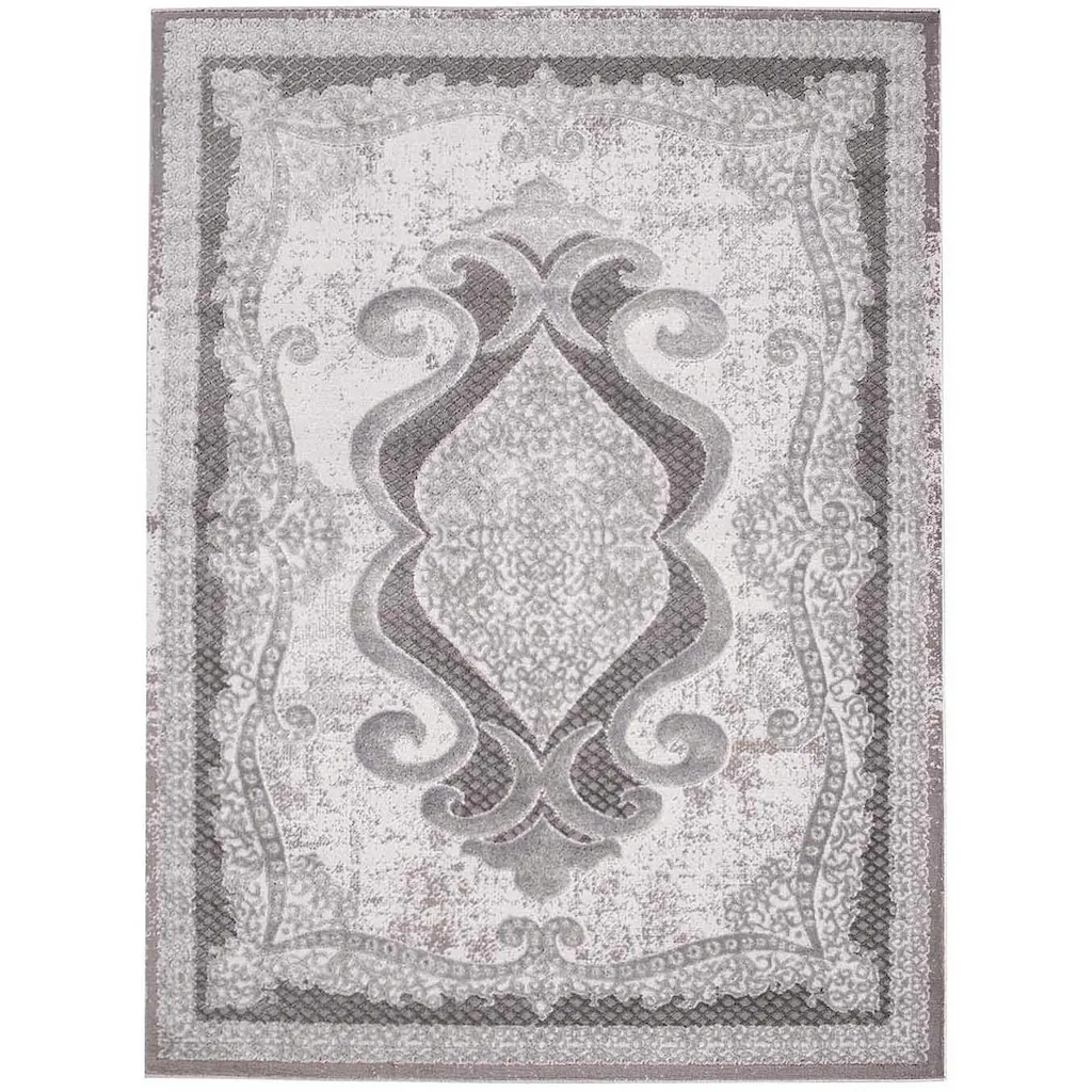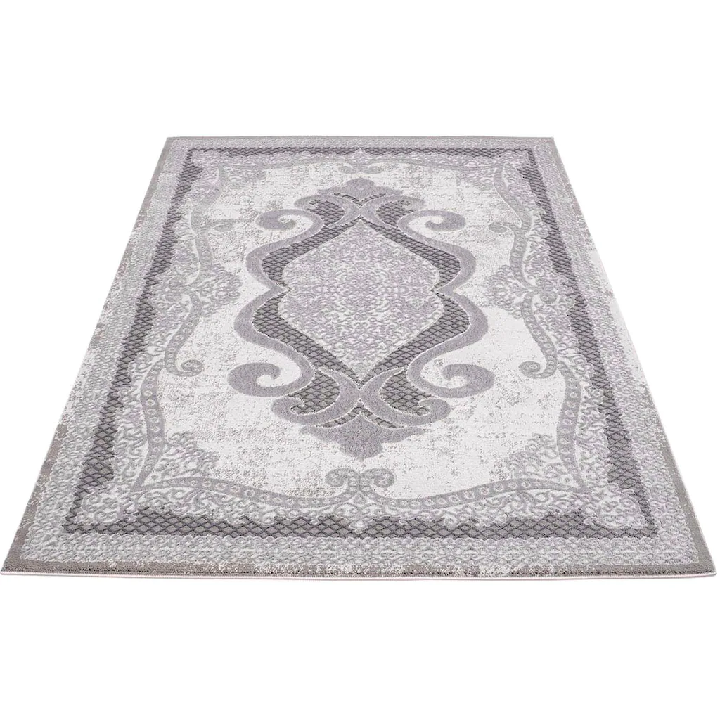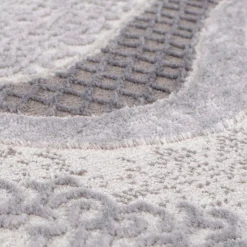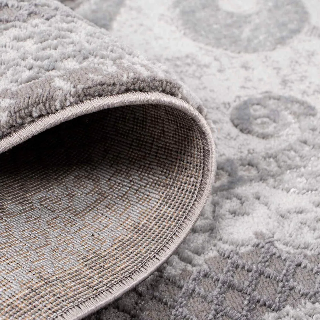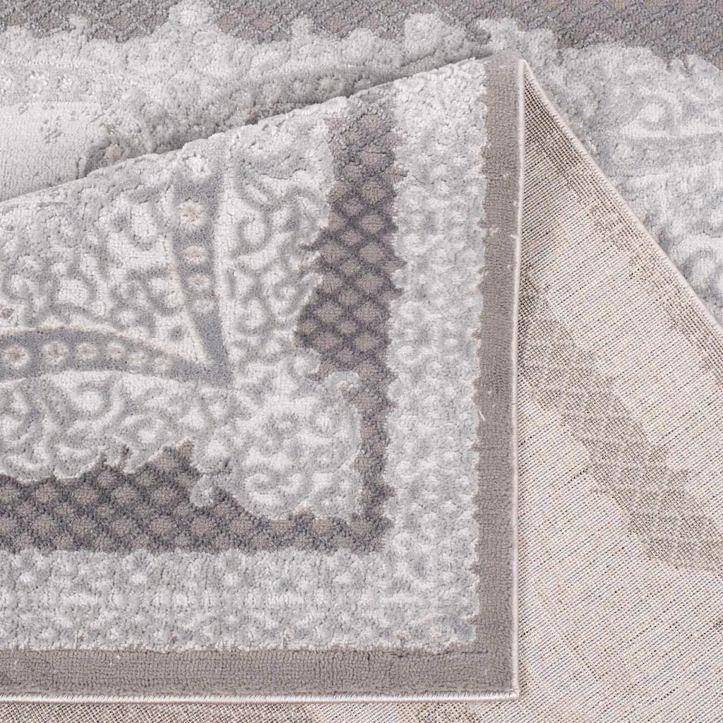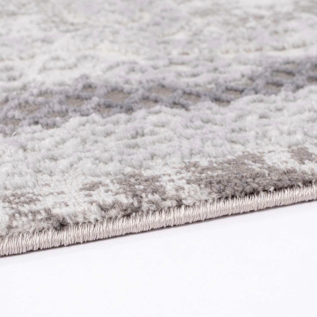 Der hochwertige Teppich zeigt sich mit seinem Muster aus Ornamenten sehr extravagant und schick. Zusammengesetzt aus floralen und filigran herausgearbeiteten Verzierungen hebt sich das kontrastreiche Design durch den verwendeten Konturenschnitt und den Schattierungen (Melierung) hervor. Ein ganz besonderer Blickfang sind die feinen Glanzfasern, die bei hellen Lichtverhältnissen zur Geltung kommen und Ihr Wohnambiente glamourös aufwerten.