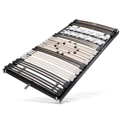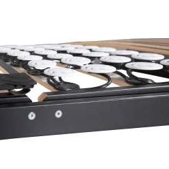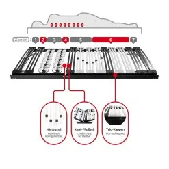 | Top-Features | Die Kappen sind holmüberdeckend gelagert. Sie bieten einen besseren Komfort, da sie eine höhere Federung zulassen. Die Matratze ist komplett bis zum Rand hin unterfedert – liegen zwei Lattenroste nebeneinander, entsteht somit keine Besucherritze.Doppelleisten zur Härtegradregulierung – Dieser Lattenrost ermöglicht es, individuelle Einstellungen vorzunehmen: Seitenschläfer stellen sich eine weiche Schulterzone ein, Bauchschläfer eine stärkere Stützfunktion, damit die Wirbelsäule nicht »durchhängt«. Je mehr Doppelleisten, desto genauer und besser kann die Einstellung erfolgen. |