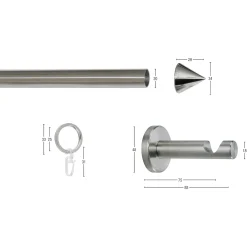 | Montagehinweise | Montage: Metallplatte mit Dübel und Schrauben an der Wand befestigen. Sockelscheibe über das Gewinde der Metallplatte stülpen. Halter auf das Gewinde drehen und die Madenschraube 4 mm mit dem Sechskantstiftschlüssel fest anziehen. Ringe an die Gardine anbringen und auf die Stange schieben. Gardinenstange in die Halter einlegen und festklipsen. Endstücke auf die Stange aufstecken. |