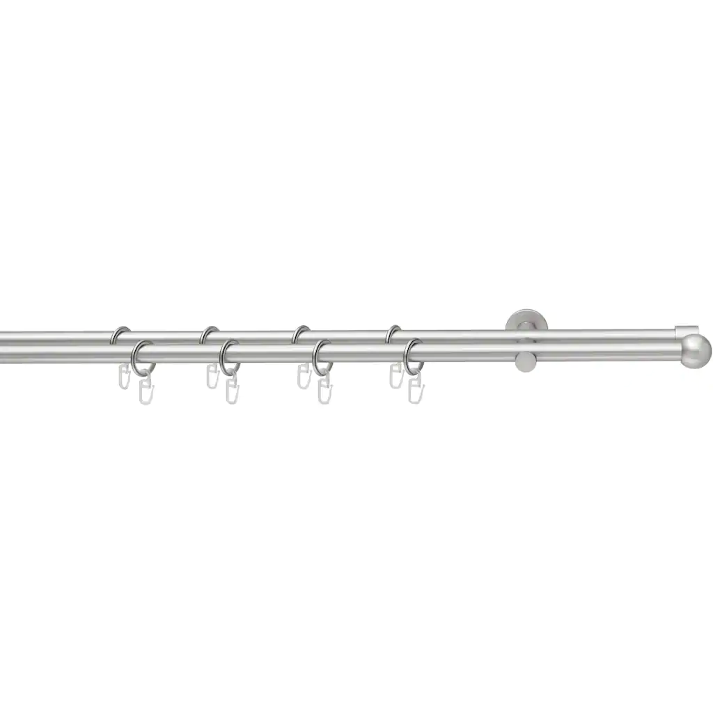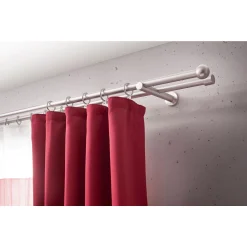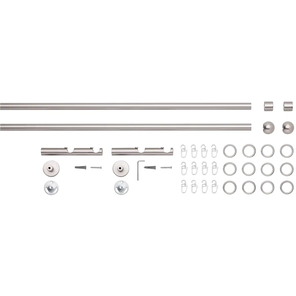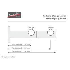Das Set ist als 2-Lauf erhältlich und wird komplett mit Ringen und Faltenhaken geliefert. Die Ringe besitzen eine Kunststoff-Einlage für leichtes Gleiten. Die Wandhalter (2 St., ab 200 cm 3 St., ab 400 cm 4 St.) mit innenliegender Montagescheibe geben leichten bis mittelschweren Vorhangstoffen zuverlässigen Halt. Ab 240 cm Länge wird die Stange geteilt und mit Verbinder geliefert.