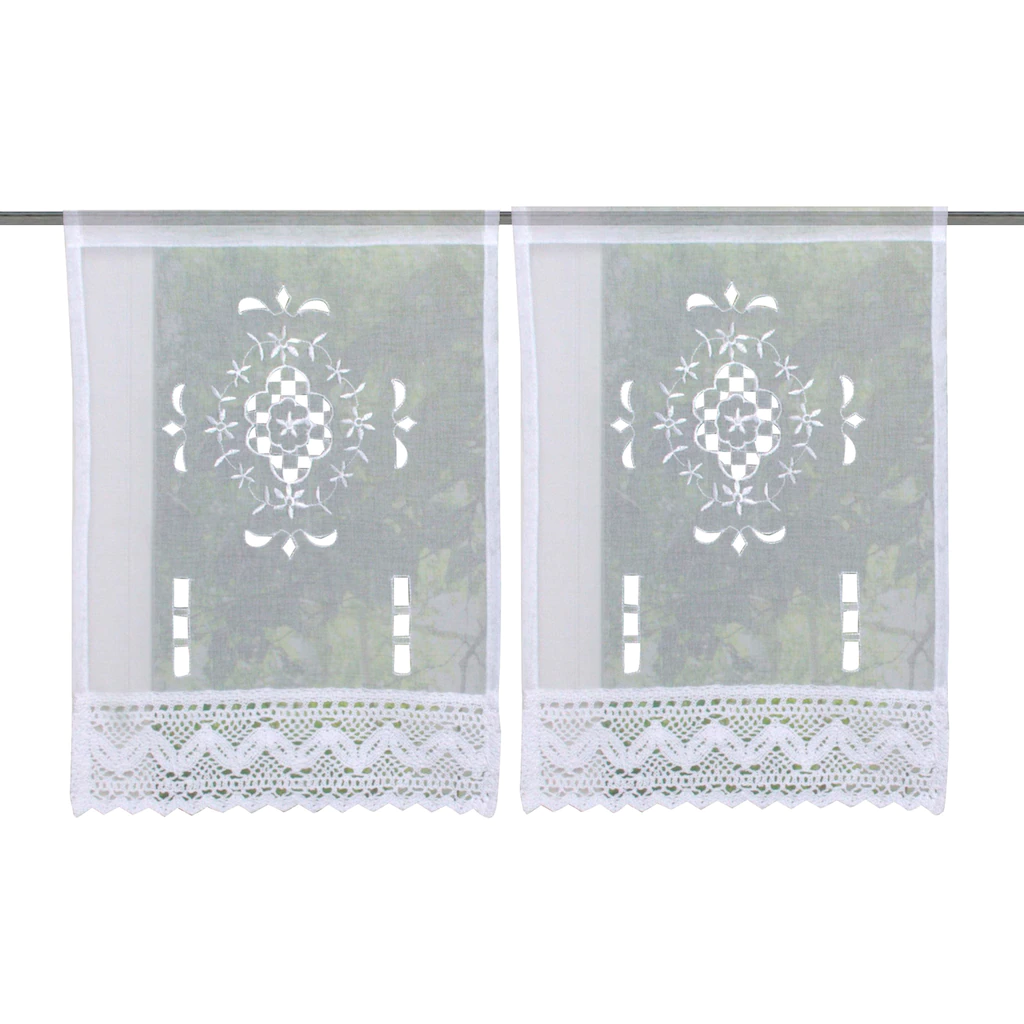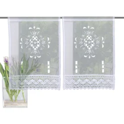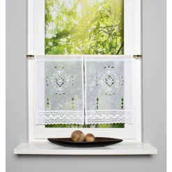 Tolle Optik in diesem Handarbeitslook. Ein Fensterbehang/Türbehang mit einer schönen Lochstickerei verfeinert. Durch die fein strukturierte Leinenstruktur, ideal für wohnliches Ambiente wie z.B. im Landhausstil. Oben mit einem Tunnel für Ihre Vitragenstange. Unten vollendet eine Macrameebordüre den hochwertigen Look. 100% Polyester