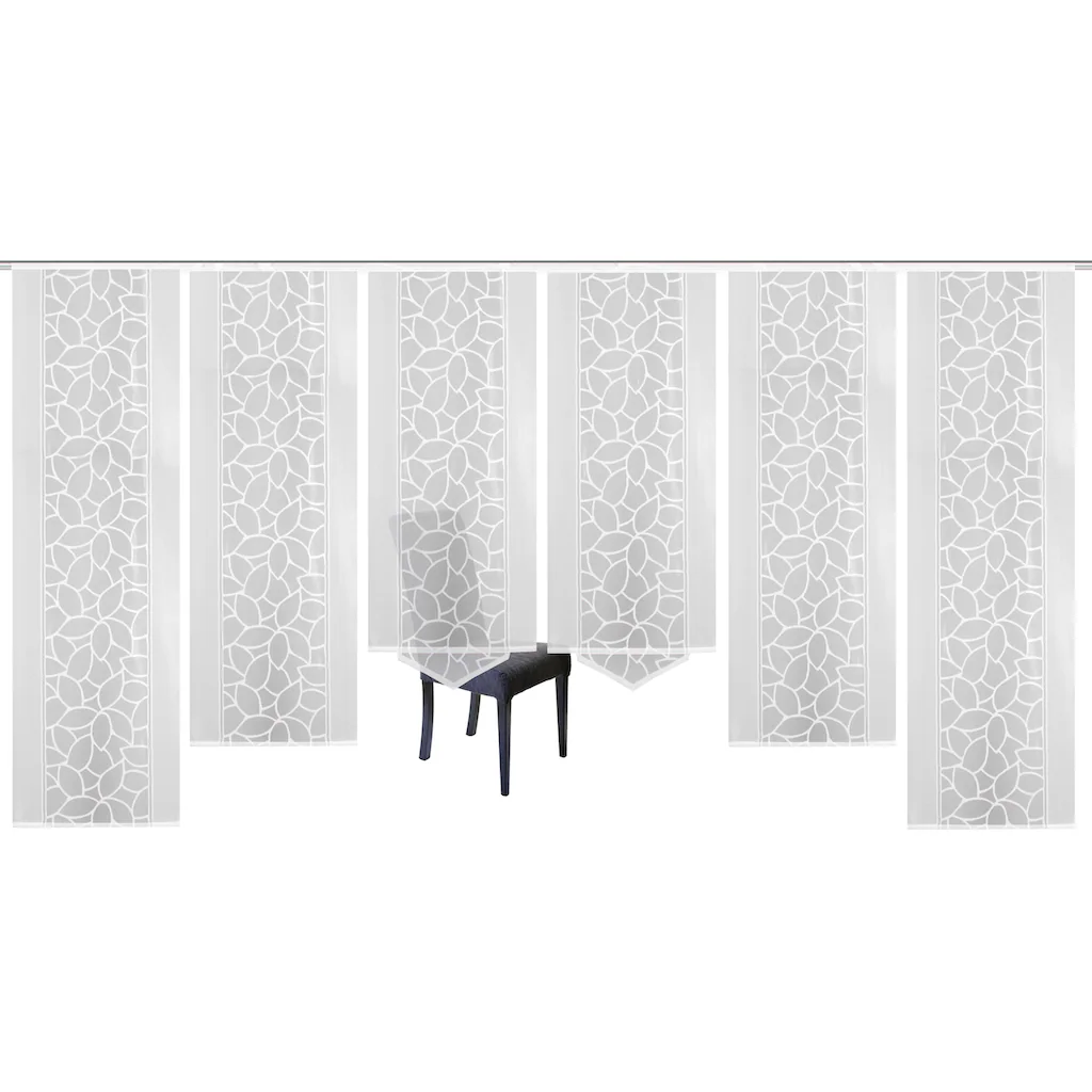 Das zarte Blätterdesign auf dem transparenten Jacquardgrund fügt sich optisch ausgezeichnet in verschiedene Wohnstile ein. Das Set besteht aus 4x Schiebevorhängen mit geradem Abschluss (2x Höhe 225cm und 2x Höhe 245cm) und 2x Schiebevorhängen mit Dreiecksabschluss (Höhe 160cm). Aufhängung erfolgt mittels Flauschband und Klettschiene an Ihrer Gardinenschiene. »JENNA« lässt sich dank des mitgelieferten Zubehörs spielend einfach an gängigen Gardinenschienen anbringen, so zaubern Sie mühelos eine behagliche Wohlfühlatmosphäre in Ihren vier Wänden. Zur Beschwerung und Stabilisierung dient die beiliegende Beschwerungsstange.