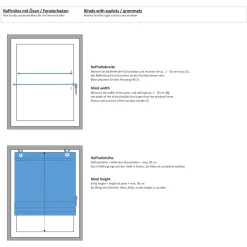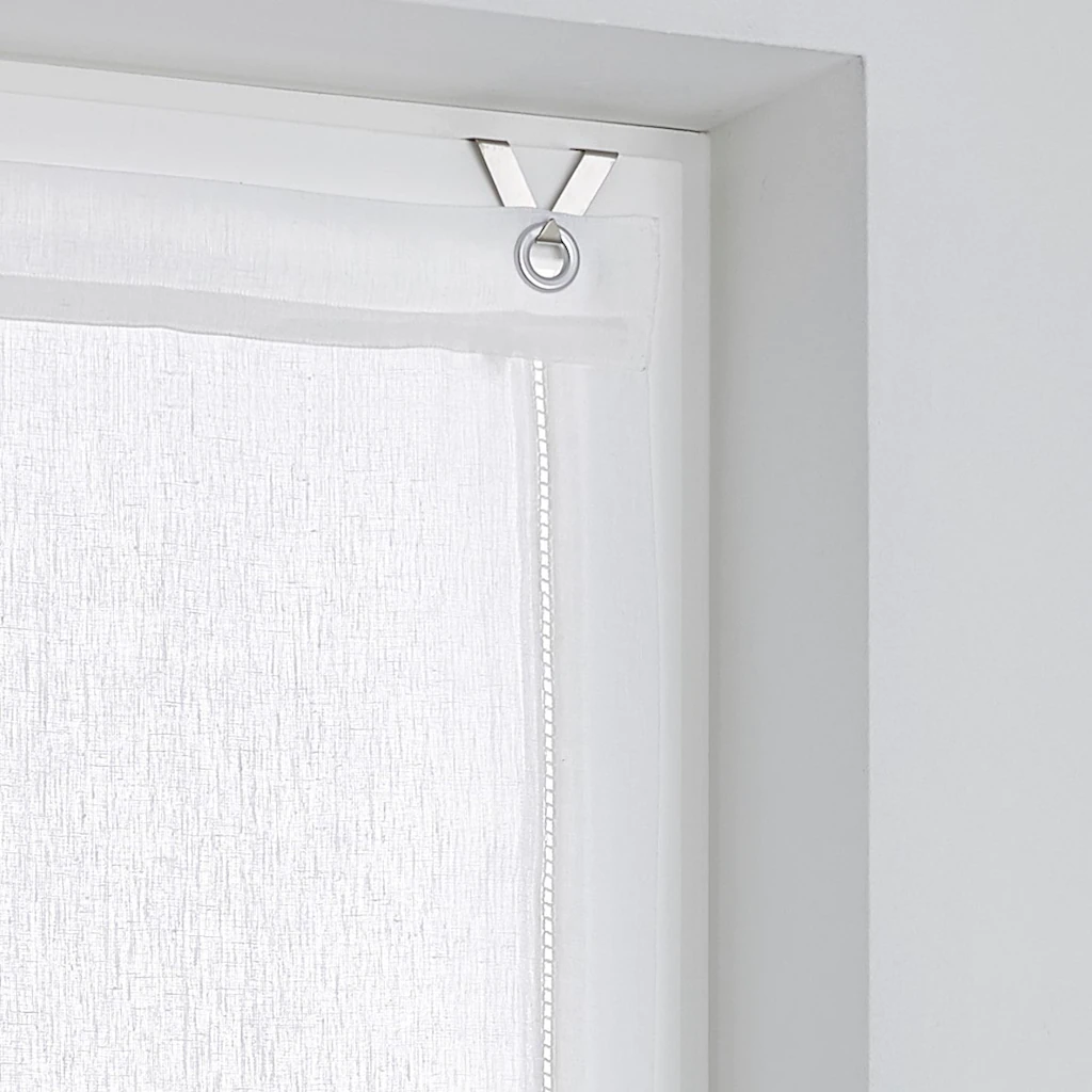 | Hinweis Aufhängung | Die mitgelieferten Halterungen werden in den Fensterrahmen eingehängt und das Rollo an den dekorativen Ösen einfach eingehakt. Geeignet für Fensterflügelstärke zwischen 13 mm und 19 mm. |