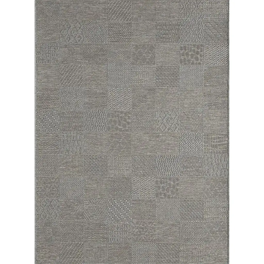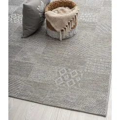 Das Muster des Outdoor Teppichs Ottowa besteht aus mehreren Quadraten und erinnert an einen fein gefliesten Steinboden. Die einzelnen Quadrate haben unterschiedliche wiederkehrende Muster und setzen eigene Akzente mit Rauten, Streifen, Kreisen, Rippen und Zickzackformen. Die Musterung bildet ein harmonisches Gesamtkonzept und sorgt für eine gemütliche Atmosphäre.