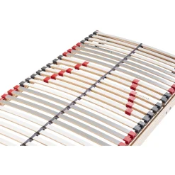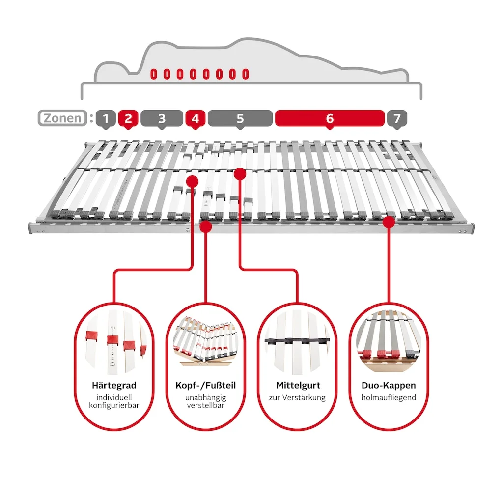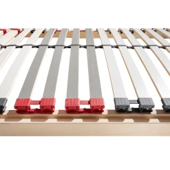 | Top-Features | Doppelleisten zur Härtegradregulierung – Dieser Lattenrost ermöglicht es, individuelle Einstellungen vorzunehmen: Seitenschläfer stellen sich eine weiche Schulterzone ein, Bauchschläfer eine stärkere Stützfunktion, damit die Wirbelsäule nicht »durchhängt«. Je mehr Doppelleisten, desto genauer und besser kann die Einstellung erfolgen.Die Kappen sind holmüberdeckend gelagert. Sie bieten einen besseren Komfort, da sie eine höhere Federung zulassen. Die Matratze ist komplett bis zum Rand hin unterfedert – liegen zwei Lattenroste nebeneinander, entsteht somit keine Besucherritze. |