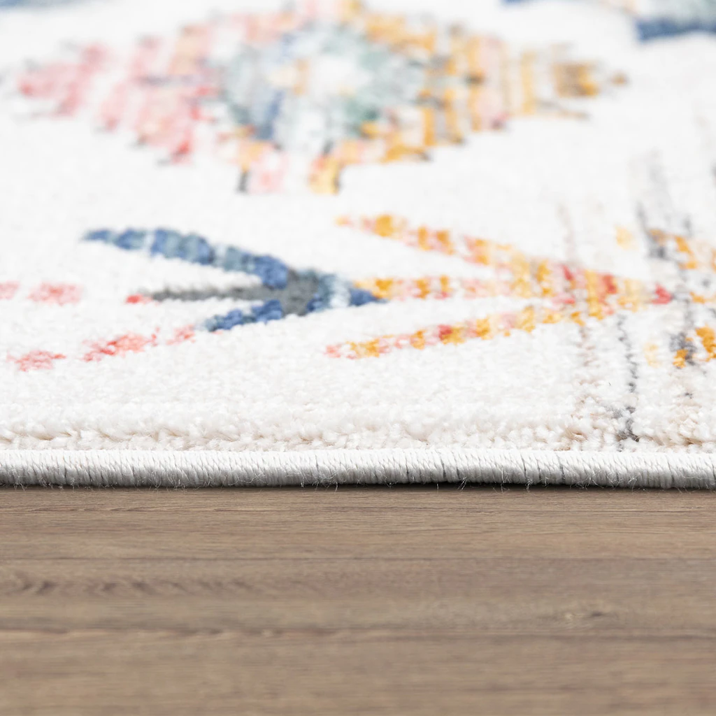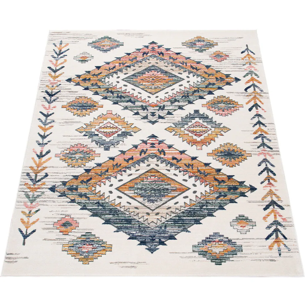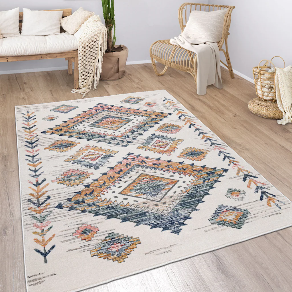 Urtümliche Behaglichkeit in Ihren vier Wänden. Holen Sie sich mit diesen optimistisch hellen Teppichen ein Stück Entschleunigung und Ruhe in Ihr Wohnzimmer und genießen Sie rustikale Idylle. In freundlichem Creme fügen sich die Teppiche liebevoll in Ihren Wohnstil ein und vergrößern optisch mit dem strahlenden Farbton gekonnt Ihr Lieblingszimmer. Die markanten, leicht unregelmäßigen Rauten-Muster verleihen den fröhlichen Teppichen eine ordentliche Portion Ethno-Charme und punkten so mit authentischem Charakter und exotischem Flair ? ganz gleich, ob im Ess-, Schlaf- oder Wohnzimmer!Auch wenn die helle Farbgebung und die filigranen Ethno-Designs eigentlich nicht danach aussehen, so sind die qualitätsvollen Kurzflor-Teppiche doch unerwartet robust und überraschen mit ungeahnter Widerstandsfähigkeit. Aus einem vielseitigen und robusten Polypropylen-Polyester-Gemisch hergestellt, vereinen Sie die besten Pflegeeigenschaften beider Materialien und sind leicht zu reinigen, unempfindlich und dank des trittfesten Flors auch für viel durchlaufene Bereiche geeignet.