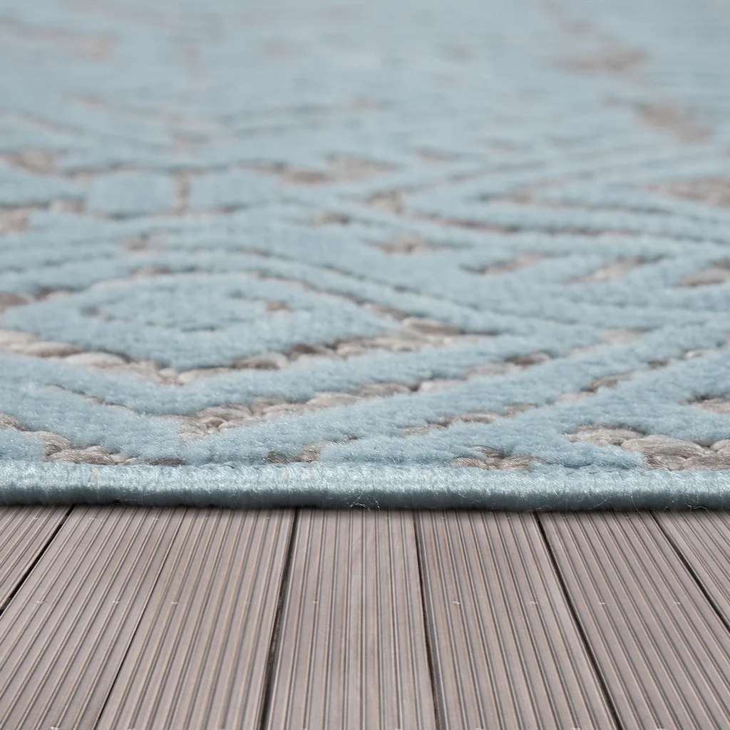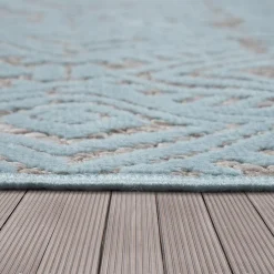 Den Sommer in schlichter Eleganz genießen: Holen Sie sich mit diesen noblen In- und Outdoor-Teppichen echte Stilwunder auf Ihren Balkon oder Ihre Terrasse! Auch wenn sie sich farblich in dunklem Grau und Türkis zurückhalten, sorgen diese vornehmen Flachgewebe doch für eine zauberhaft edle Atmosphäre. Stilvolle Ethno-Designs werden von dem aufwendigen Cut-Loop-Verfahren kunstvoll hervorgehoben, was den Teppichen nicht nur eine aufregende 3-D-Optik verleiht, sondern auch ein spannendes Laufgefühl auf Ihren Boden bringt! Damit das zeitlose Erscheinungsbild auch wirklich zeitlos bleibt, nutzen wir für die Herstellung der Kunstwerke ausschließlich robustes Polypropylen. Dieses Multitalent unter den Materialien ist nahezu unverwüstlich, kinderleicht zu reinigen und damit wie für die Verwendung auf dem Balkon oder der Terrasse geschaffen. Strapazierfähig und wetterfest überstehen die Teppiche so jeden auch noch so schlimmen Regenguss und nehmen Ihnen auch das ein oder andere Missgeschick bei der Gartenarbeit nicht übel. *Bei Nässe und starker Feuchtigkeit sollten Sie die Teppiche trotz wetterfesten Materialien an einem trockenen, überdachten Ort trocknen und auslüften lassen