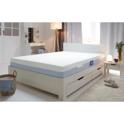 | Details Matratzenbezug | Bezug mit Reißverschluss und Sommer- und Winterseite; Winterseite (weiß): Doppeltuch 330 Gramm aus 100% Polyester, Sommerseite (blau): 3D-Abstandsgestrick 320 Gramm aus 100% Polyester |