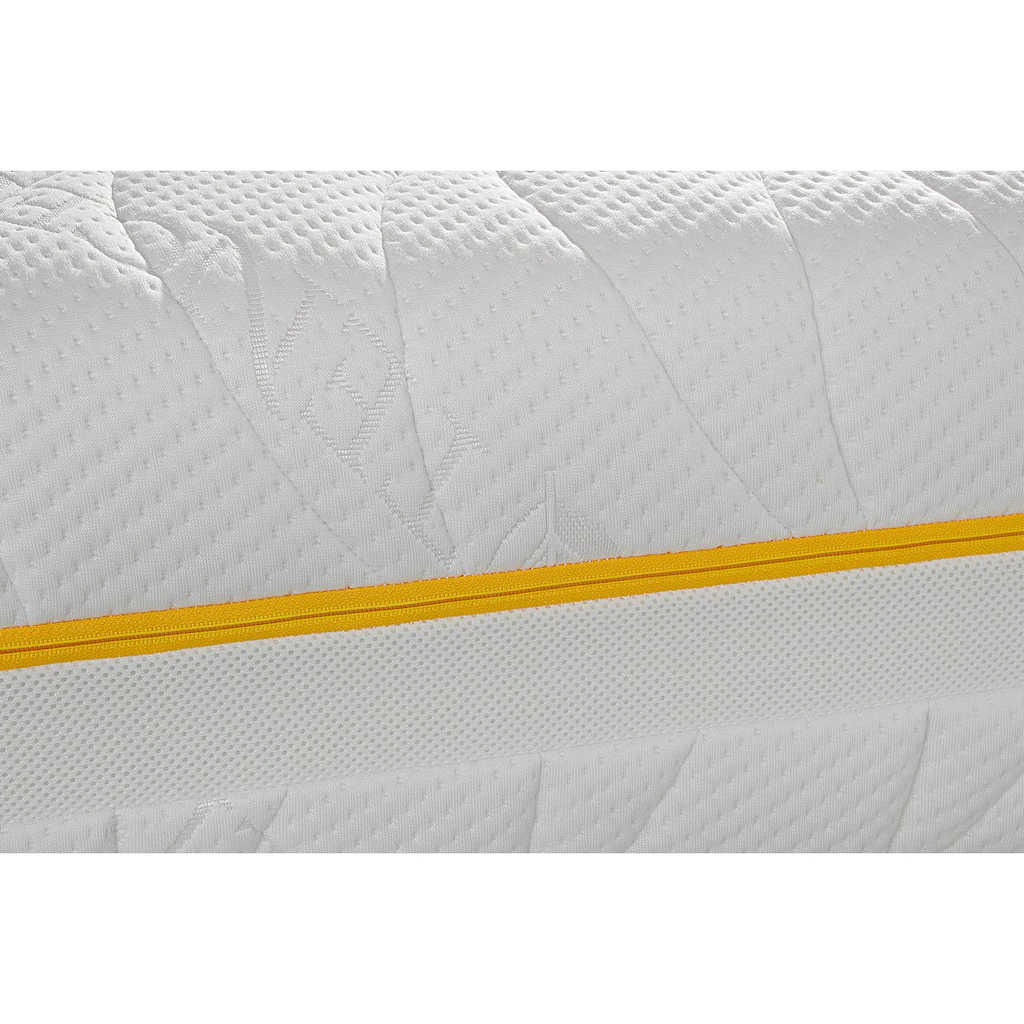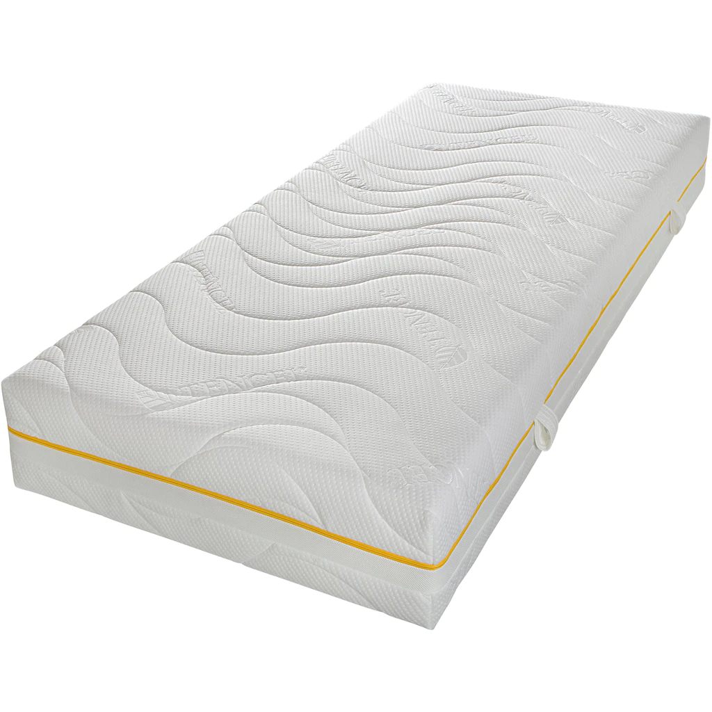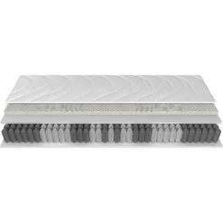 | Kernaufbau | Gelschaum (Noppenstruktur, 4 cm hoch, 50 kg/m³), Komfortschaum (kein Schnitt, 2,5 cm hoch, 30 kg/m³), Taschen-Federkern (15 cm hoch, 4 Federn bei 100×200 cm), Komfortschaum (kein Schnitt, 2,5 cm hoch, 30 kg/m³) |