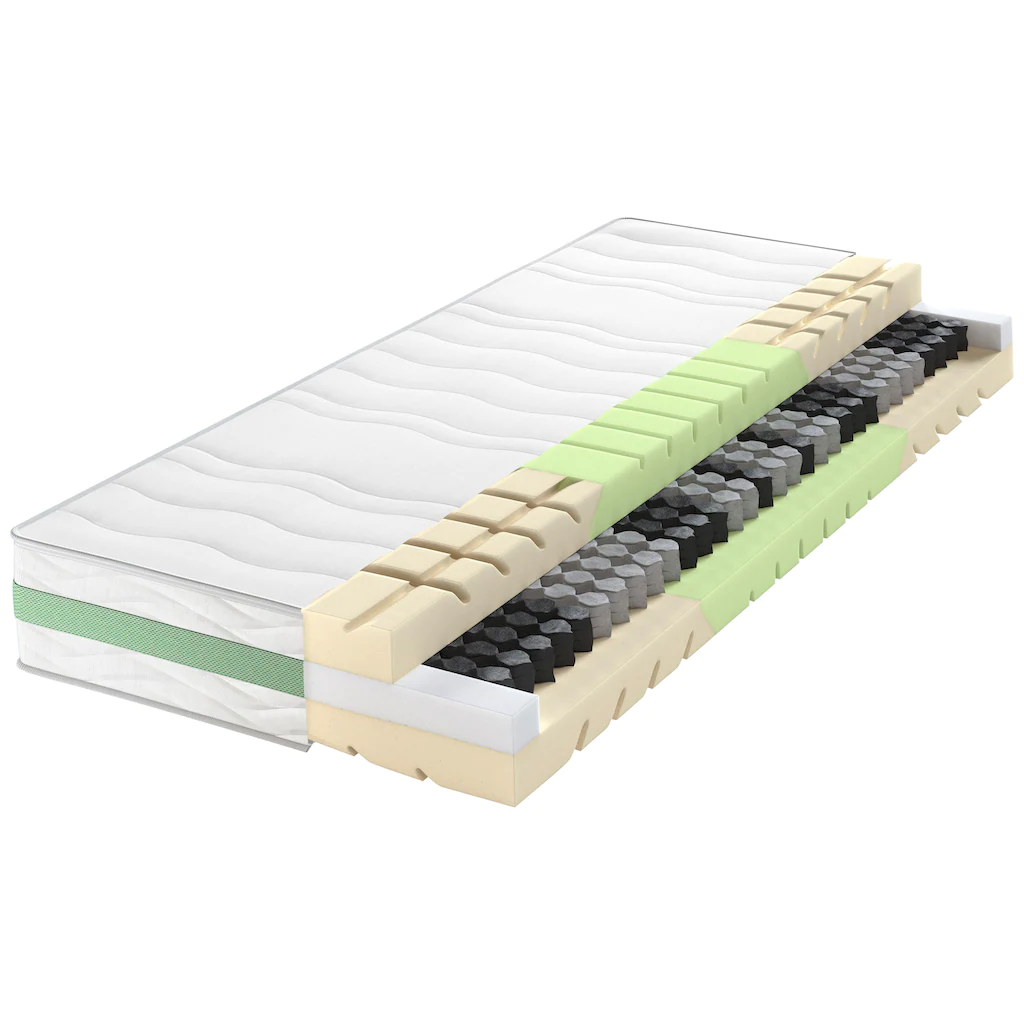 | Kernaufbau | Kaltschaum (vertikale, horizontale Einschnitte, 8 cm hoch, 40 kg/m³), Taschen-Federkern mit 278 Federn bei 100x 200cm (6 cm hoch) , Kaltschaum (vertikale, horizontale Einschnitte, 8 cm hoch, 40 kg/m³) |