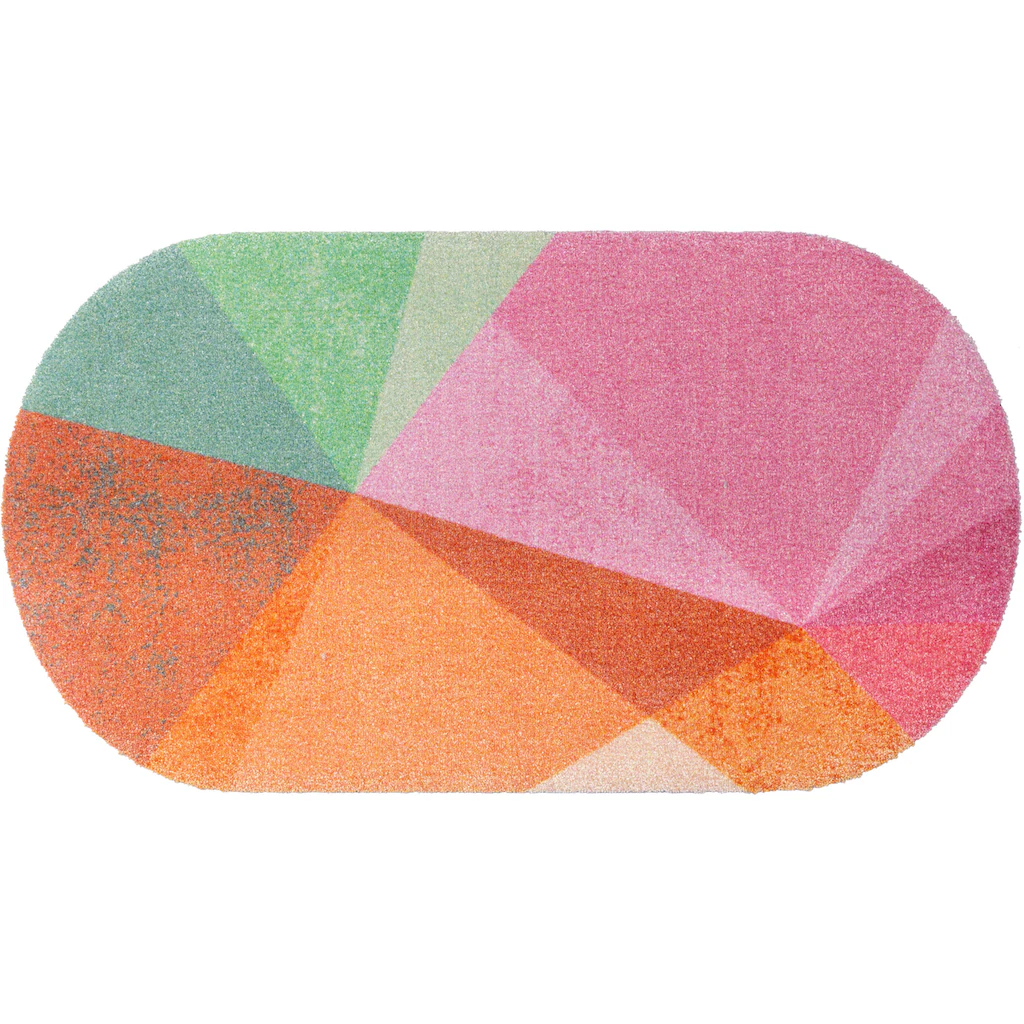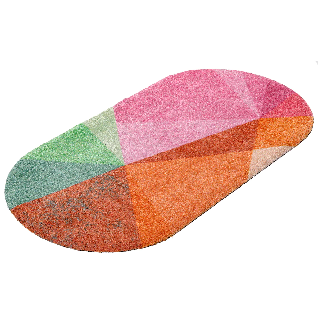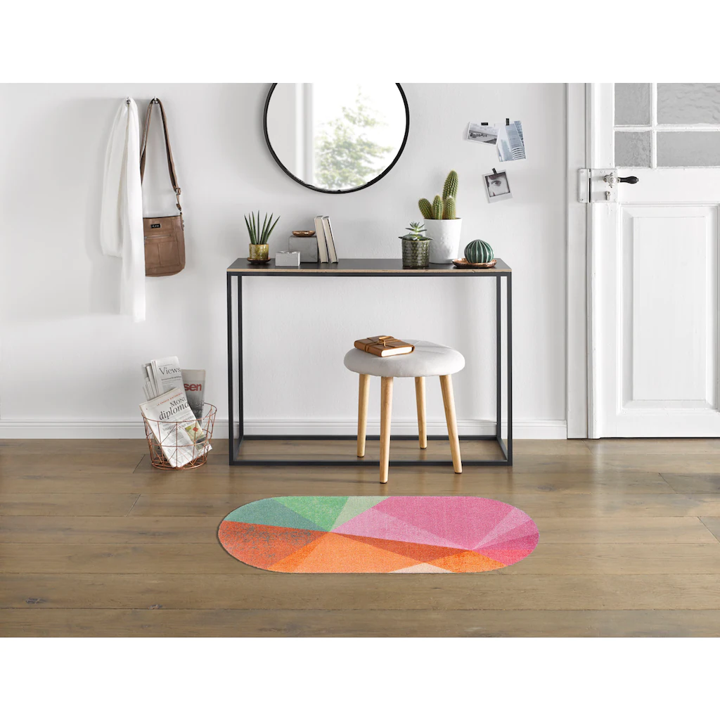 Der Teppich mit Funktion. Die randlosen Teppichmatten aus der DECOR Produktlinie von wash+dry by Kleen-Tex vereinen die hygienischen Funktionen einer Fußmatte mit den optischen Ansprüchen eines Teppichs. Ohne sichtbaren Trittrand! Das Design Thoran ist ein langgezogenes Oval und kann mit dieser Form super flexibel eingesetzt werden. Das Muster erinnert an den Blick durch ein Kaleidoskop. Die harmonische Farbkombination aus Rosé-Orange- und Grün-Mint-Tönen kann vielseitig eingesetzt werden. Diese Teppichmatte passt zum Beispiel perfekt in Wohnräume und Wintergärten, aber auch im Eingangsbereich oder im Bad ist sie mit Sicherheit ein toller Blickfang. Neben dem dekorativen Aspekt kommt bei allen wash+dry Matten und Läufern die Funktion nicht zu kurz. Zuverlässig nimmt der flache, dichte Flor aus Polyamid Schmutz und Feuchtigkeit auch in hoch frequentierten Bereichen auf. Für die tägliche Reinigung ist der Teppich leicht zu saugen und auch für den Saugroboter geeignet, da der Flor flach ist. Die rutschhemmende Rückenbeschichtung aus Nitrilgummi sorgt für sicheren Stand. Aufgrund von Farbechtheit und Formstabilität kann die Bodenmatte einfach bei 60 Grad in der Waschmaschine gewaschen werde, beachten Sie dabei bitte die Höchstlast Ihrer Waschmaschine! Den Teppich anschließend bitte sofort flach zum Trocknen auslegen! Der Sauberlaufteppich ist 100% PVC-frei. Bei PVC-Böden, Linoleum Böden und frisch geölten Parkett Böden kann es durch eine Wechselwirkung mit gummibeschichteten Matten zu einer Farbveränderung der Oberfläche kommen. Für alle Produkte behalten wir uns eine produktionsbedingte Toleranz in der Größe von +/- 3% vor. Farbabweichungen können auftreten.