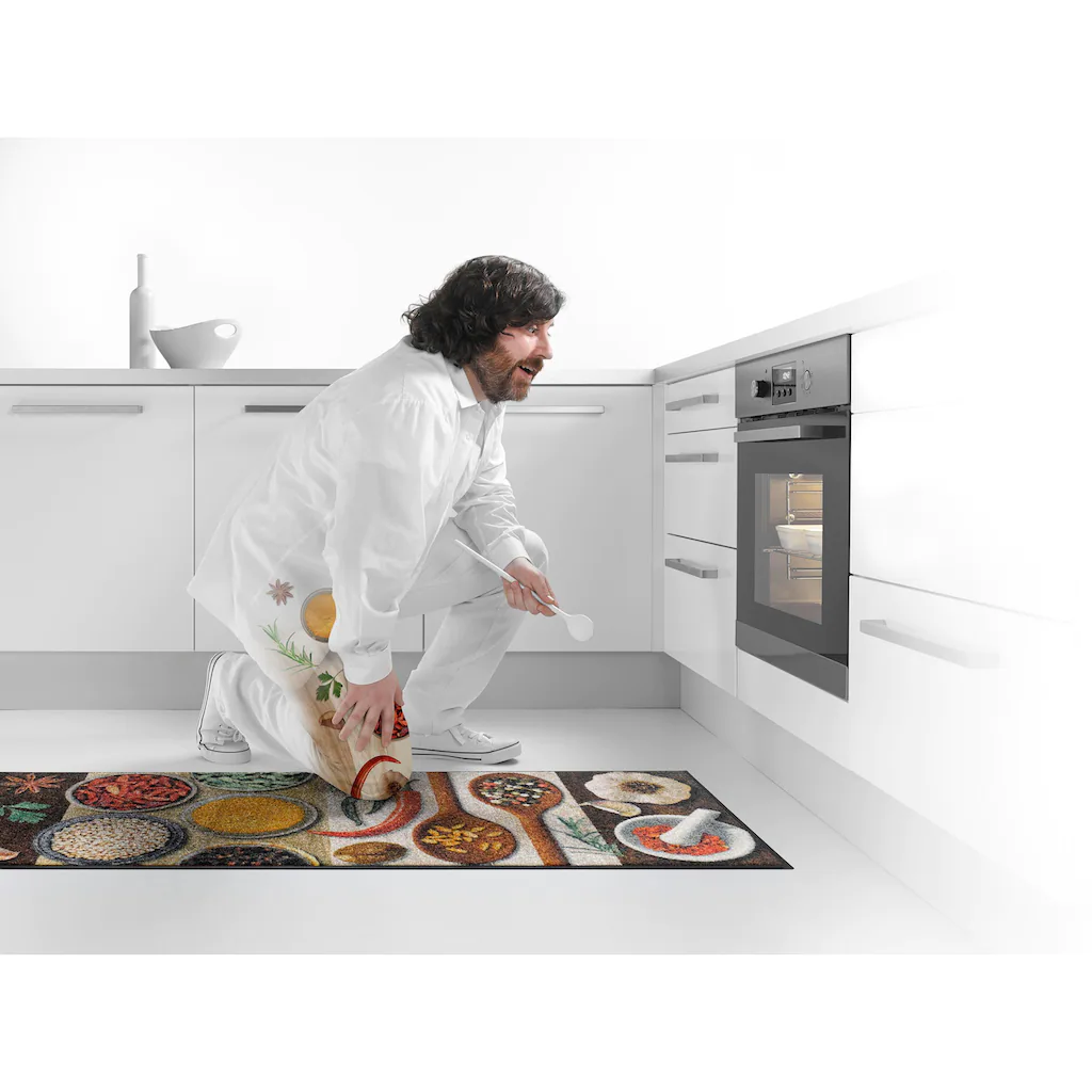 Für mehr Würze in der Küche. In harmonischen Erdtönen kombiniert mit farbintensiven Details präsentiert sich der Teppichläufer »Hot Spices« von wash+dry by Kleen-Tex. Scharfe Gewürzsorten und Küchenutensilien in fotorealistischem Design und feiner farblicher Abstimmung vereint, sorgt der Läufer beispielsweise in Küchen für würzig-heiße Akzente. Doch nicht nur optisch sind Matten der Marke wash+dry by Kleen-Tex eine ausgezeichnete Wahl. Neben dem dekorativen Aspekt kommt bei allen wash+dry Matten und Läufern die Funktion nicht zu kurz. Zuverlässig nimmt der flache, dichte Flor aus Polyamid Schmutz und Feuchtigkeit auch in hoch frequentierten Bereichen auf. Die rutschhemmende Rückenbeschichtung aus Nitrilgummi sorgt für sicheren Stand. Aufgrund von Farbechtheit und Formstabilität kann die Matte einfach in der Waschmaschine und auch im Trockner gereinigt werden, um die jahrelange Freude an der Matte zu gewährleisten. Der Teppich ist 100% PVC-frei.